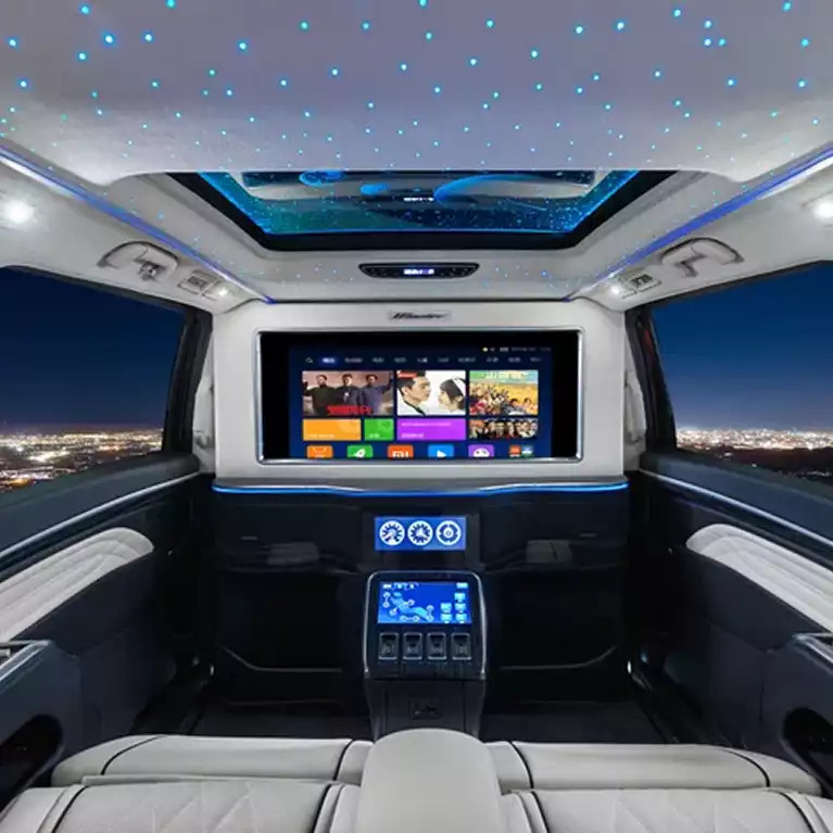 Технологии и мультимедиа представлены интеллектуальной системой бесключевого доступа и запуска двигателя, системой громкой связи Hands free, проекцией экрана телефона, беспроводной зарядкой мобильного телефона с охлаждением, 14,6-дюймовым многофункциональным сенсорным экраном с синхронизацией с приложением Carplay и 12,3-дюймовой цифровой приборной панелью, а также 34-дюймовым умным телевизором в перегородке для пассажиров заднего ряда, двумя беспроводными зарядками мобильного телефона для пассажиров второго ряда, мини-баром с охлаждением, многофункциональным сенсорным экраном управления комфортом в салоне, премиальной аудиосистемой с 13-ю динамиками, электроприводом звукоизолирующего стекла и телевизора в перегородке и пр.